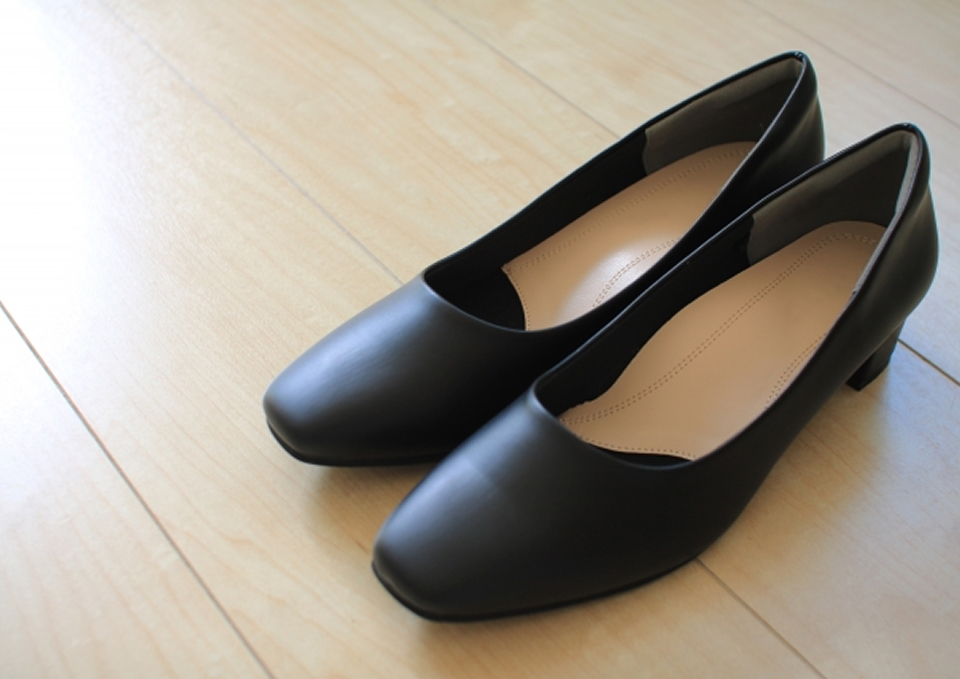 女性はつま先の浅い黒い靴が安心です。無理のない高さで、太めのかかとが望ましいです。